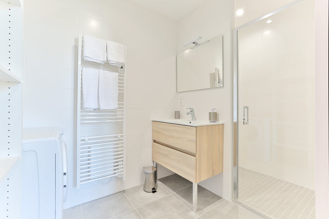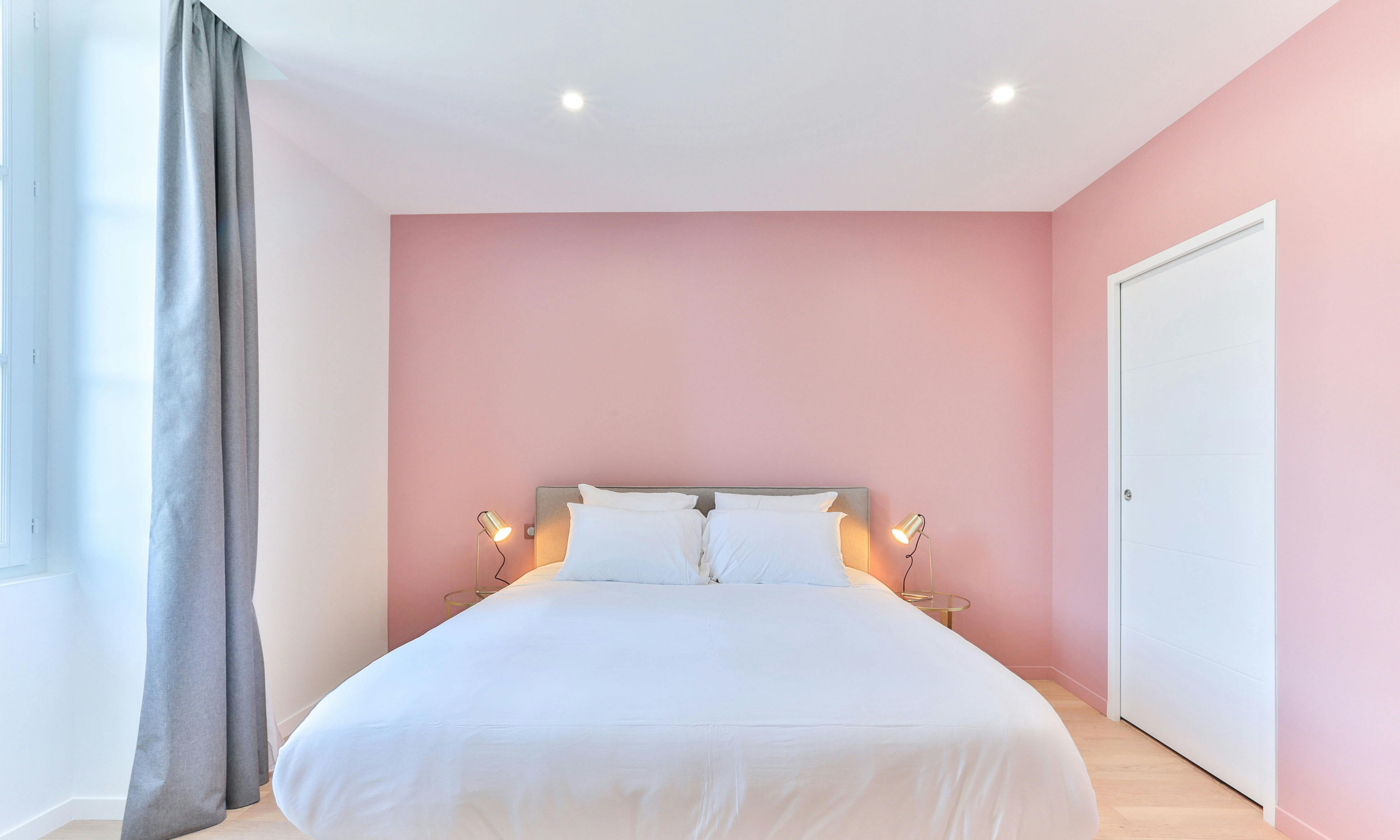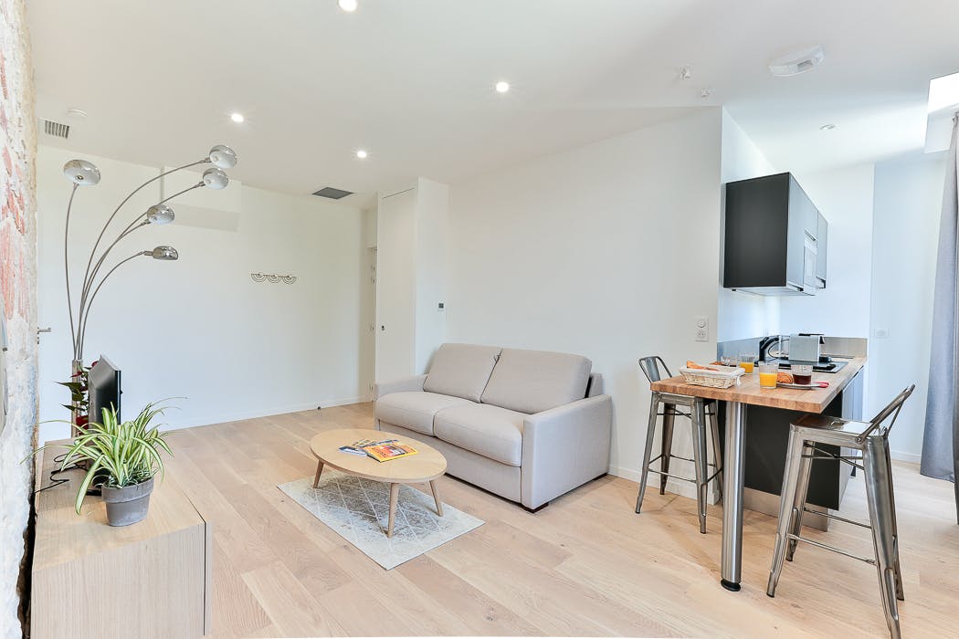 This elegant apartment, with an area of 46 m² on the second floor, overlooks an interior courtyard. It includes a bedroom with a 180 cm king-size bed, a living room with a 140 cm sofa bed, an equipped kitchen open to the living room, and a dining area. The bathroom has a large Italian shower. The linen and the apartments are cleaned by professionals at the end of the stay.
