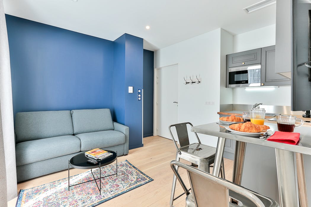 This elegant apartment, with an area of 37 m² on the second floor, overlooks rue Mariotte. It includes a bedroom with a 180 cm king-size bed, a living room with a 140 cm sofa bed, an equipped kitchen open to the living room, and a dining area. The bathroom has a large Italian shower. The linen and the apartments are cleaned by professionals at the end of the stay.